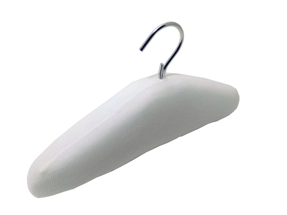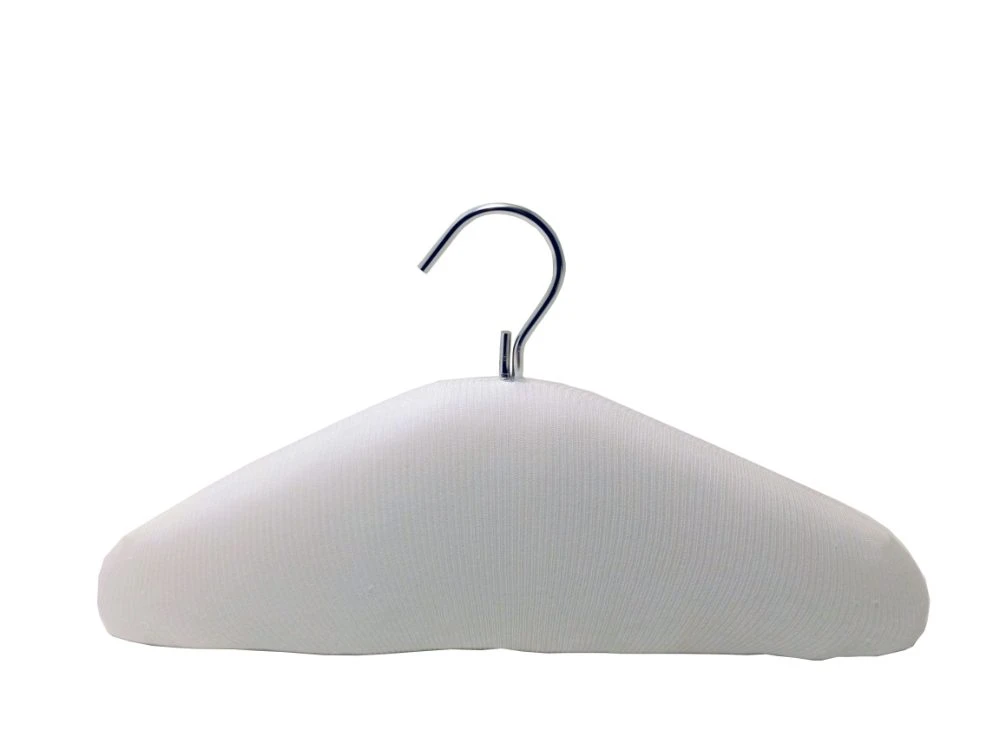 Aluminium hanger embedded in an Ethafoam block reducing stress on clothing.